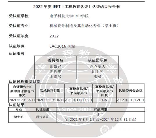 根据IEET认证规范,此次认证结果有效期限为2021年8月1日-2024年12月31日,机械设计制造及其自动化专业还须在2025年度接受周期性审查。