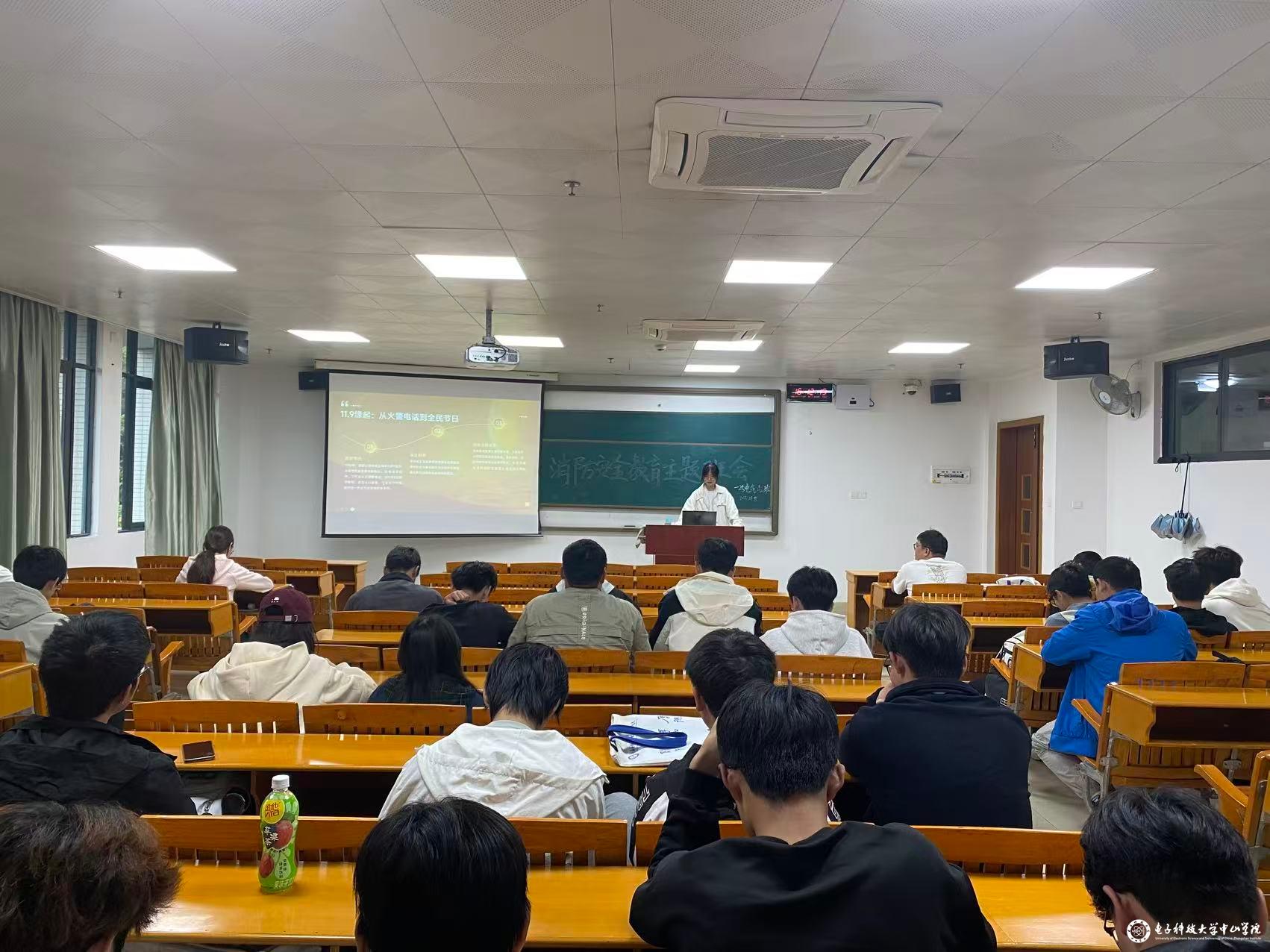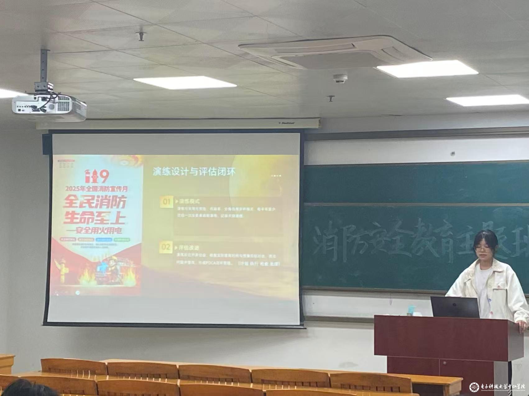 在知识普及环节,戴绮悦结合图文并茂的PPT,系统讲解了火灾三要素(可燃物、助燃物、火源)及六类火灾类型(A-F类),并通过动画演示直观呈现火灾蔓延途径。针对不同场景,她提出针对性防范措施:家庭需定期检查电气线路与燃气设备,公共场所应确保疏散通道畅通,校园内严禁违规用电用火。同时,她强调要牢记“一懂三会”(懂火灾危险性,会报警、会灭火、会逃生)和“四个能力”(检查消除火灾隐患能力、扑救初期火灾能力、组织疏散逃生能力、消防宣传教育能力)。