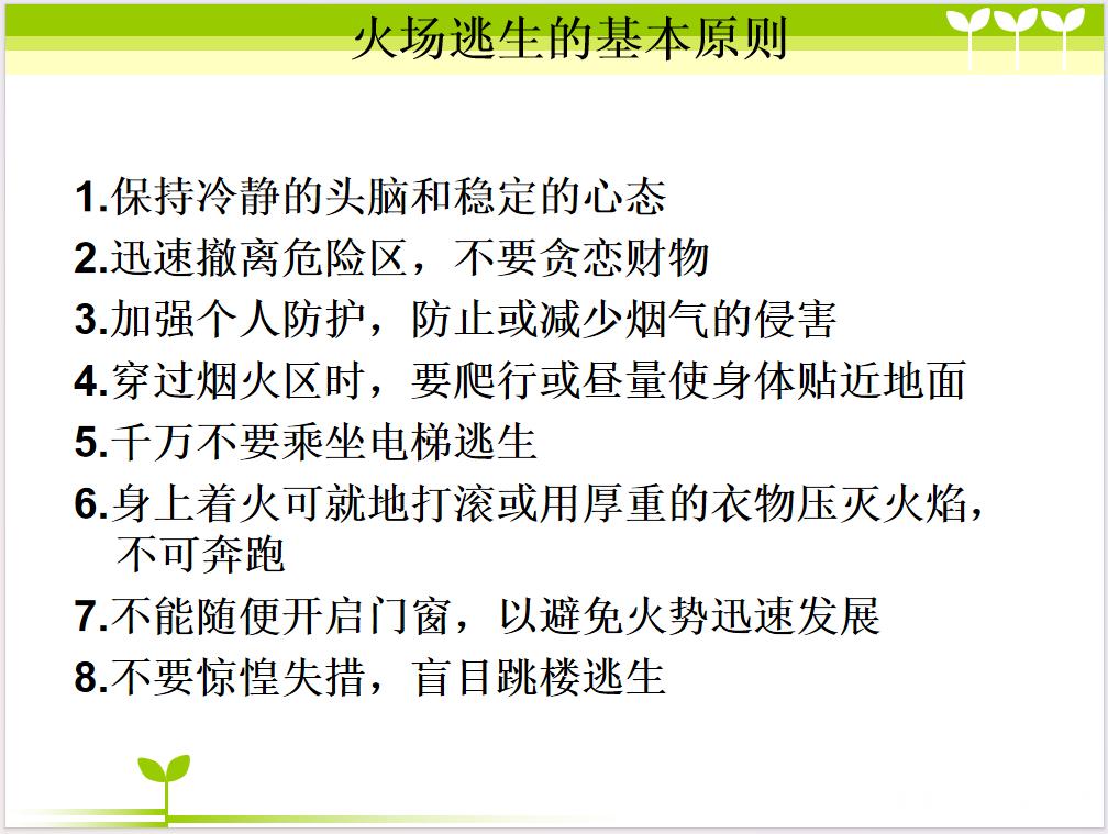 火场逃生时,必须牢记“生命至上”的原则,并在遇到火情时保持冷静。湿毛巾捂住口鼻,低姿弯腰迅速撤离;不乘坐电梯,循疏散指示灯方向;若通道被封,应退回房间,用湿布封堵门缝,在窗口用醒目物品发出求救信号,等待救援。发现火情立即拨打119,报警时需清晰说明详细地址、起火物质、火势大小及有无人员被困,并派人在路口引导消防车。