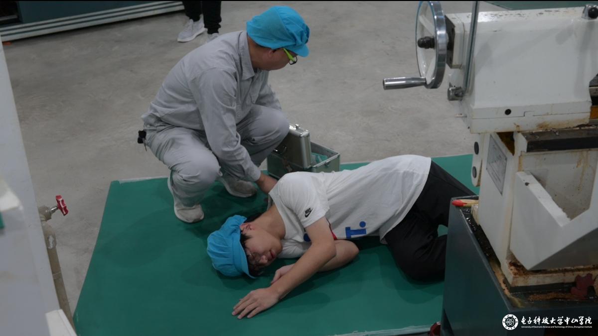 首先,由金工实习课程的何炳超老师给班级学生进行安全教育知识讲座,为学生讲解近期在其他院校发生的实验室安全事故案例,学院对实验室安全教育的重视,以及开展实验室安全专项演练的重要性和意义,然后由金工实习课程的何炳超和陈智锋两位老师讲解本次安全专项演练的具体内容、步骤流程和注意事项。此次演练所模拟的场景为,学生在实习过程中,突发未固定好的加工件飞出砸中一名学生致其受伤倒地,由现场教师按照此类情况的应急管理办法,对学生实行施救并安抚其他学生情绪。
