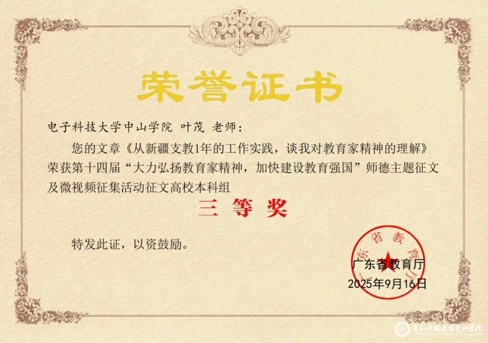近日,我院叶茂博士在广东省教育厅第十四届“大力弘扬教育家精神,加快建设教育强国”师德主题征文及微视频征集活动征文高校本科组荣获三等奖。这一荣誉不仅是对叶茂博士个人的充分肯定,更是对我院师德建设的有力鼓舞!