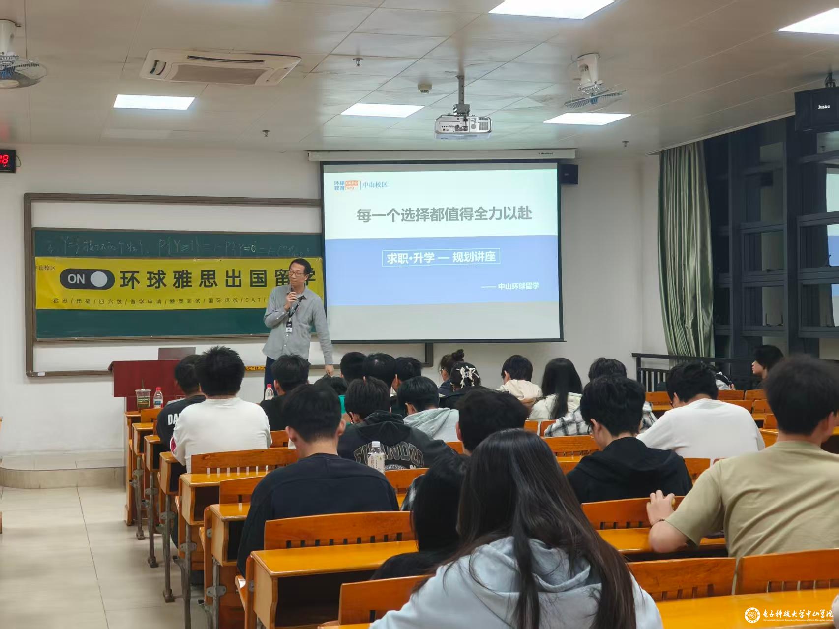 为帮助我院学子明晰升学与就业方向,2025年10月23日晚上7点,中山环球教育在厚B108开展专题宣讲会,吸引100余名同学到场参与,现场氛围活跃。