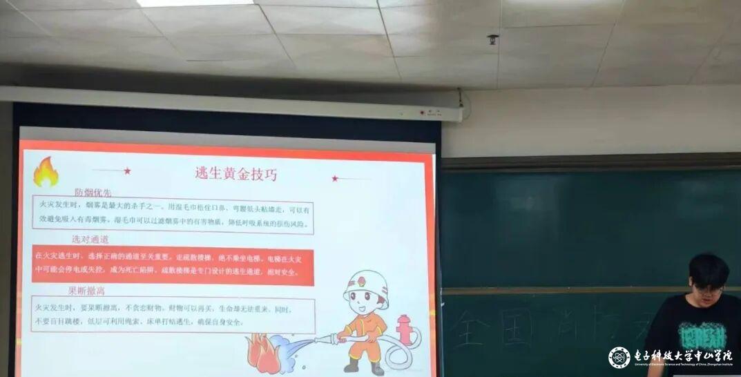 在应急逃生技能讲解环节,主持人聚焦“科学报警、逃生防护、路线选择、被困自救”四大核心要点,进行系统讲解:明确火灾发生时需及时拨打119报警电话,准确说明起火地点、火势情况等关键信息;强调逃生时需用湿毛巾捂住口鼻、弯腰低姿前行,避免吸入有毒烟雾;着重提醒严禁乘坐电梯,需沿疏散楼梯有序撤离,切勿贪恋财物。同时,针对房门发热、楼道被浓烟封堵等特殊场景,详细讲解了关闭房门、堵塞门缝、窗口求救等实用自救方案,帮助同学们熟练掌握科学逃生技巧。