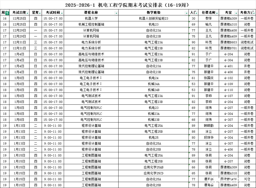 2025-2026-1 3044am永利集团官网期末考试安排表(16-19周)