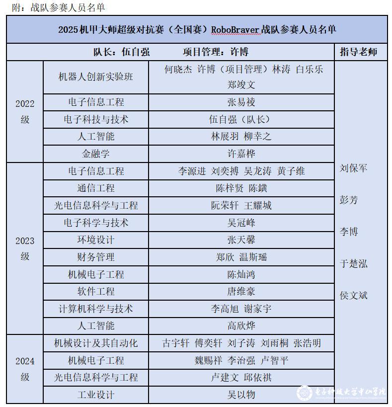 我校RoboBraver机器人战队是一支由全校多学院学生组成的机器人团队,致力于机器人技术的探索与实践。在RoboMaster2025机甲大师超级对抗赛全国赛中,战队共有27名正式队员,划分为结构、电路、电控、视觉和运营五个部门,共同承担机器人设计与制作、电路设计与调试、程序开发与优化、对战策略训练、宣传推广及项目管理等任务。战队成员来自3044am永利集团官网、电子信息学院、计算机学院、艺术设计学院、经贸学院等多个学院,汇聚了来自不同专业的机器人工程师,共同参与全国大学生机器人大赛等高水平竞赛,不断提升科技创新能力、团队协作能力与项目管理能力,为机器人技术的发展贡献青春力量。